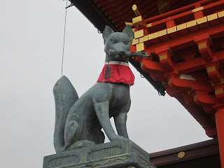 Good old Wikipedia informs me that foxes are seen as messengers, and are often seen in Inari shrines. The stone foxes at this shrine held a key in their mouths, which is the key to the rice granary, so there we go! (My apologies at not remembering more about this place!)
